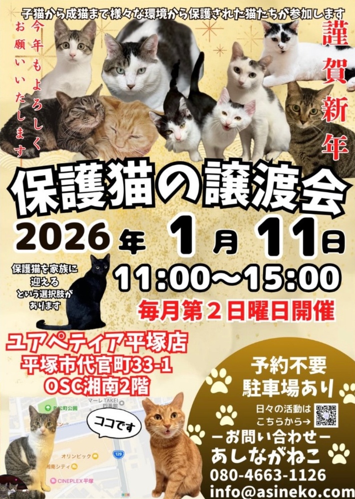 下記の平塚ユアペティア様で開催される、あしながねこさん主催の譲渡会にCAT AIDも参加させて頂く予定です。